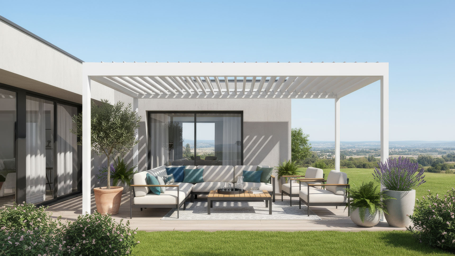 La pergola bioclimatique permet de maîtriser les apports solaires grâce à l’orientation de ses lames, qui régulent naturellement la lumière et la ventilation. Elle crée une zone d’ombre agréable sur la terrasse tout en limitant l’impact du rayonnement solaire sur la façade et les baies vitrées, contribuant ainsi à un meilleur confort thermique au quotidien.