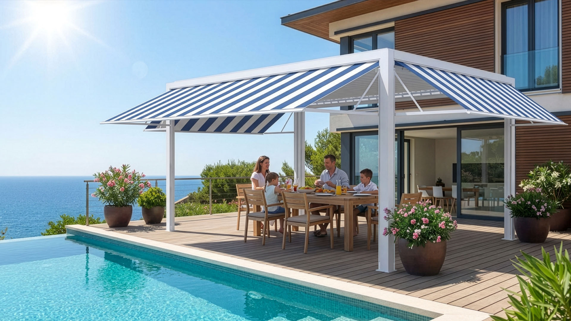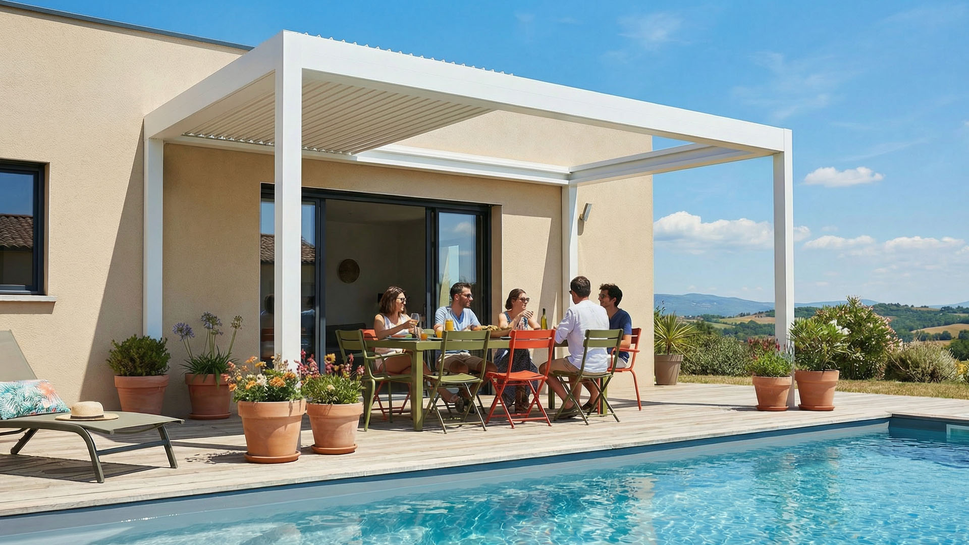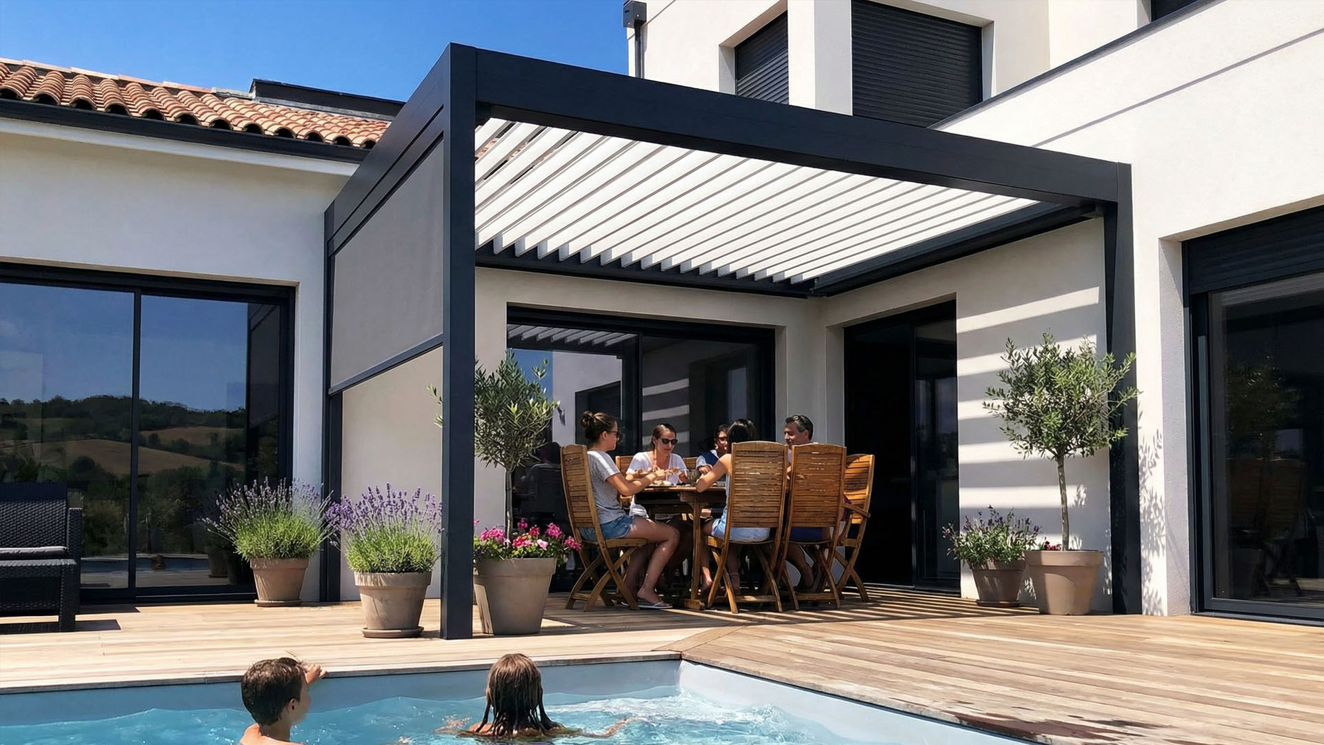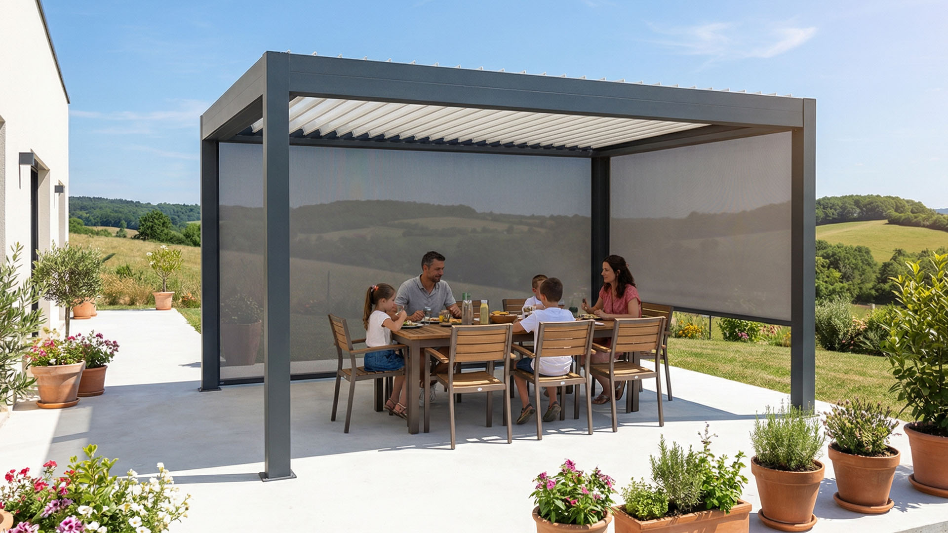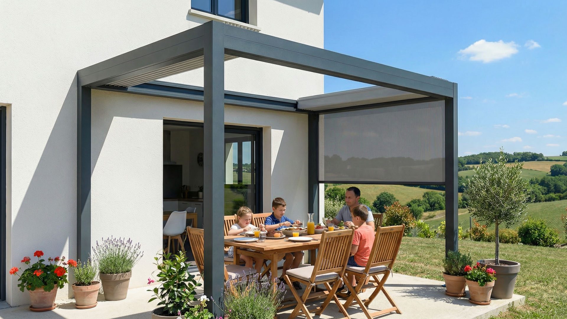 Avec son design contemporain et ses lignes épurées, la pergola bioclimatique structure élégamment l’espace extérieur. Elle transforme la terrasse en véritable espace de vie et apporte une réelle valeur ajoutée esthétique et immobilière à votre habitation.