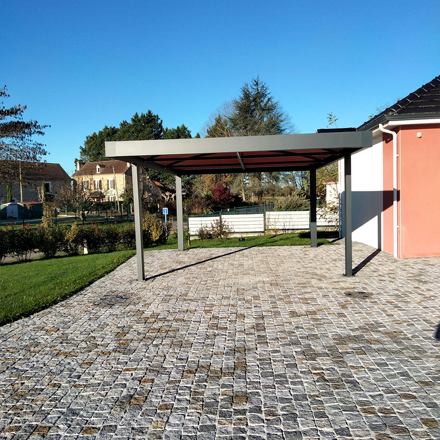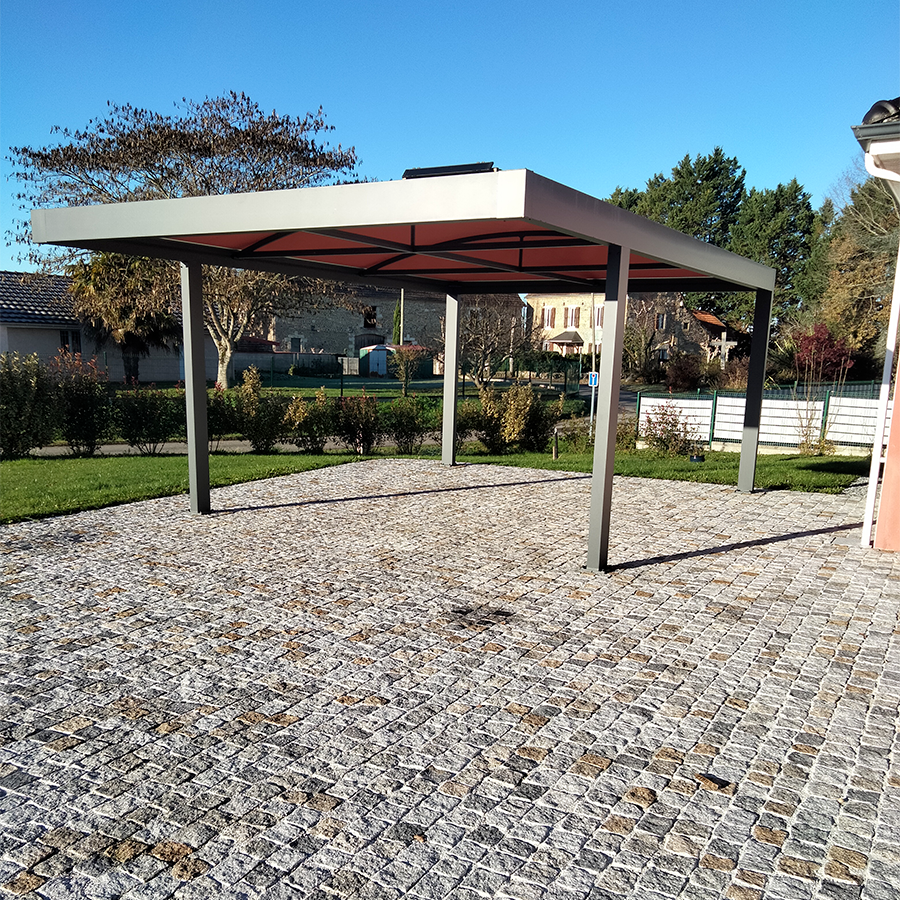 Réalisation d’un carport moderne à Bayonne, conçu par Walter Stores, alliant design et fonctionnalité. Ce carport est équipé d’un éclairage d’accueil alimenté par un panneau solaire, offrant une solution à la fois esthétique et éco-responsable. Sa structure en aluminium gris anthracite (FS 7016) associée à une membrane rose nacrée (équivalence RAL 3033) apporte une touche contemporaine et élégante, parfaitement intégrée à l’environnement extérieur.