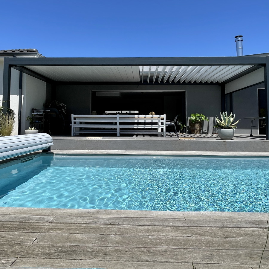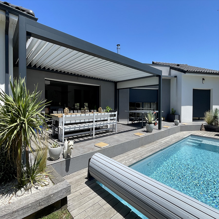 Pergola OPEN XXL posée par l’agence Walter Stores Colomiers, ce modèle bioclimatique se distingue par son design moderne et ses lignes épurées. Sa structure en gris anthracite FS 7016 s’accorde parfaitement avec les lames blanches RAL 9016, apportant luminosité et élégance à l’espace extérieur. Conçue pour réguler l’ensoleillement et protéger des intempéries, elle offre un confort optimal au quotidien. Robuste et durable, la pergola OPEN XXL valorise la terrasse toute l’année.