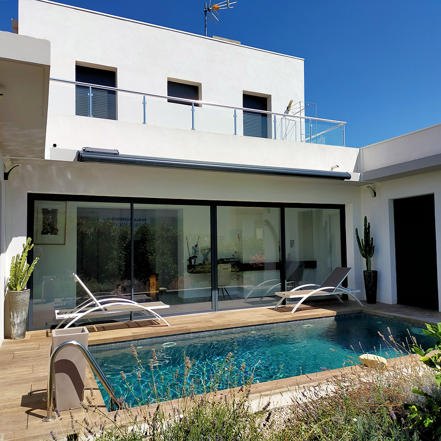 Store Ambre Solaire posé par l’agence Walter Stores Bayonne, ce modèle au design contemporain associe une structure en gris anthracite FS 7016 à la toile Dickson ORC U786 Étain Link, au rendu élégant et moderne. Grâce à son fonctionnement solaire autonome, il ne nécessite aucun raccordement électrique et s’inscrit dans une démarche éco-responsable. Offrant une protection solaire performante, il allie confort d’utilisation, robustesse et esthétisme pour valoriser durablement les espaces extérieurs.