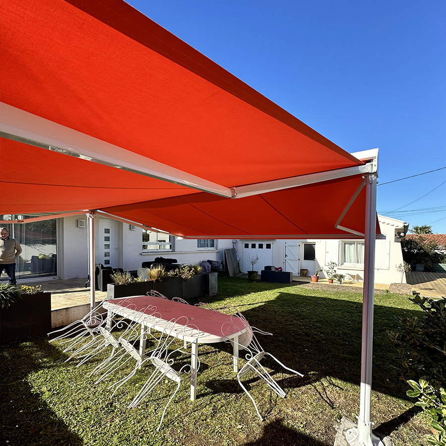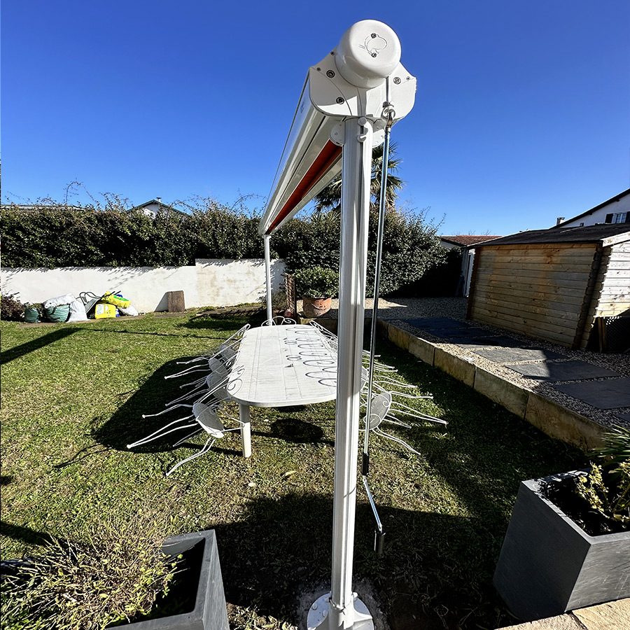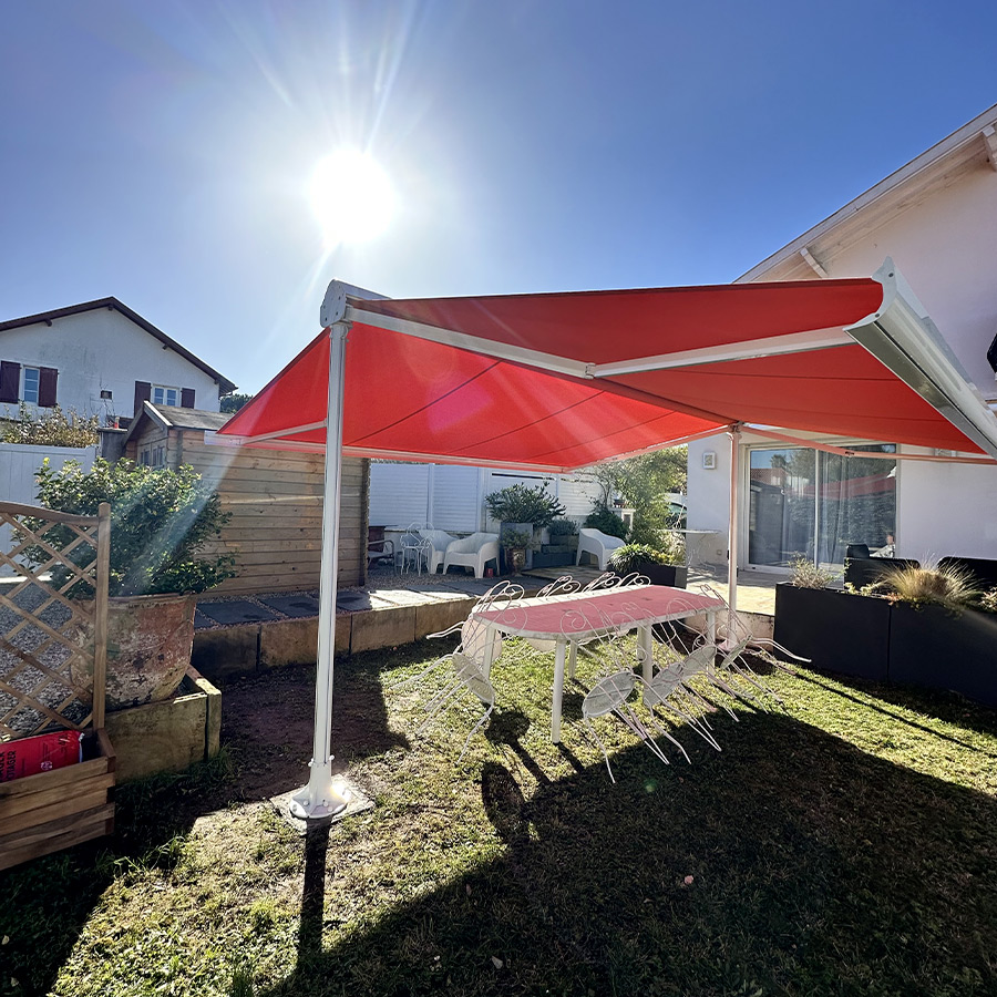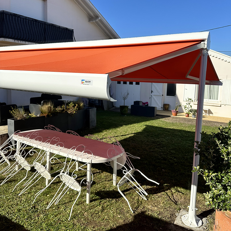 Store élégant et contemporain posé par l’agence Walter Stores Bayonne, ce modèle associe une structure blanc RAL 9016 à une toile Dickson ORC U767 Tangerine. Son coloris lumineux apporte une touche chaleureuse et moderne tout en offrant une protection solaire performante. Un choix esthétique et durable qui valorise la façade et améliore le confort au quotidien.
